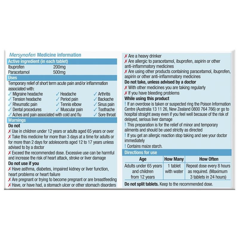 Mersynofen combines the strength of 500mg paracetamol and 200mg ibuprofen in a single tablet, delivering stronger* pain relief for up to 8 hours.