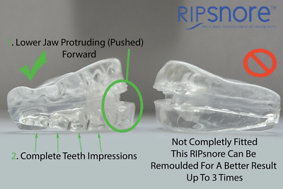 The patented technology is designed to hold the lower jaw slightly forward, this moves the base of the tongue away from the back of the airway and soft palate; allowing the throat a clear passage for easy breathing to silence snoring. As Ripnsore fits over the teeth it can be also be used to treat teeth grinding. The device has been found to be very effective in stopping or reducing snoring from customer feedback.